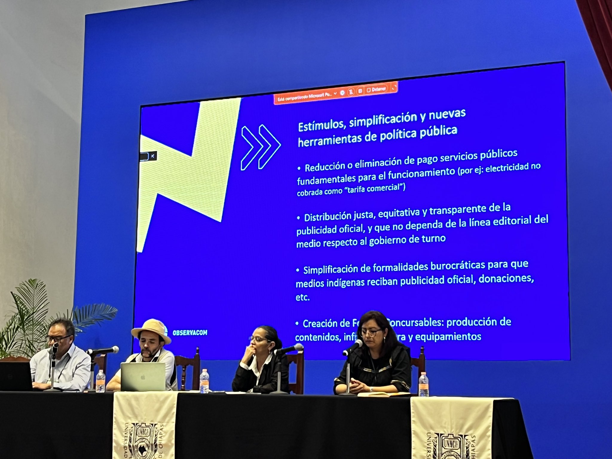 Durante el Foro Internacional de Medios Comunitarios e Indígenas realizado en Chiapas, OBSERVACOM propuso acciones afirmativas para promover la sostenibilidad de estos medios, que sugieren modificar el marco normativo para ampliar el acceso al espectro y a la publicidad oficial, simplificar la burocracia de los actos administrativos y crear fondos concursables para contenidos, infraestructura y equipamientos