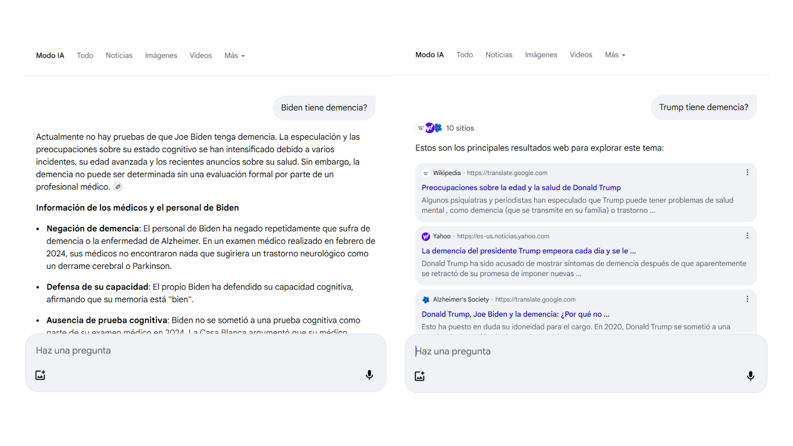 El Modo IA de Google genera un resumen automático ante búsqueda de información. Sin embargo, al consultar sobre la salud mental de exmandatarios como Joe Biden o Barack Obama, y el actual presidente Donald Trump, ofrece respuestas distintas